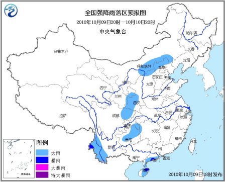 10月9日20時到10日20時,廣東西南部、海南中東部、云南西部、四川東北部、重慶東南部、貴州東北部、甘肅東部、陜西西南部、山西北部、河北西北部、內(nèi)蒙古中部偏南地區(qū)等地有大雨,其中,云南西部、海南東部、廣東西南部等地的部分地區(qū)有暴雨。上述地區(qū)局部伴有短時雷雨大風(fēng)等強(qiáng)對流天氣。