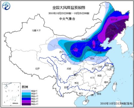 根據(jù)這份寒潮藍(lán)色預(yù)警,預(yù)計(jì),10月23日08時至25日08時,內(nèi)蒙古大部、東北、甘肅大部、西北地區(qū)東部、華北、黃淮、江淮北部等地將出現(xiàn)6~12℃降溫,其中,寧夏中部、河北西部和東北部、內(nèi)蒙古東南部、東北大部等地的部分地區(qū)降溫幅度可達(dá)14~16℃;上述大部地區(qū)有4~6級偏北風(fēng)。