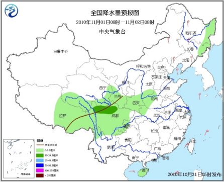 10月31日08時(shí)至11月1日08時(shí),新疆南疆盆地西北部、內(nèi)蒙古東北部、黑龍江西北部、西藏南部、青海東南部、甘肅南部、川西高原北部等地有小雨(雪)或雨夾雪;陜西西南部、四川北部等地的部分地區(qū)有小雨或陣雨。內(nèi)蒙古東部、東北地區(qū)等地有4~6級(jí)風(fēng)。臺(tái)灣海峽、臺(tái)灣以東洋面和以南海域、南海東北部、中部和西南部海域?qū)⒂?~8級(jí)、陣風(fēng)9級(jí)的東北風(fēng);東海東北部和南部海域、南海西北部海域?qū)⒂?~7級(jí)、陣風(fēng)8級(jí)的東北風(fēng)。
