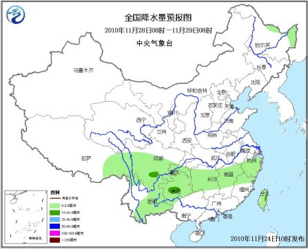 28日08時(shí)至29日08時(shí),黑龍江東北部有小雪;江南、西南地區(qū)東部、西藏東部有小到中雨。