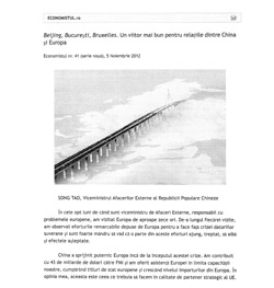 中新網(wǎng)11月9日電 據(jù)外交部網(wǎng)站消息,2012年11月5日,羅馬尼亞主流媒體《經(jīng)濟(jì)學(xué)家報(bào)》和《九點(diǎn)鐘報(bào)》分別用羅、英兩種文字全文刊登中國(guó)外交部副部長(zhǎng)宋濤署名文章《為了中歐關(guān)系的美好未來(lái)》。