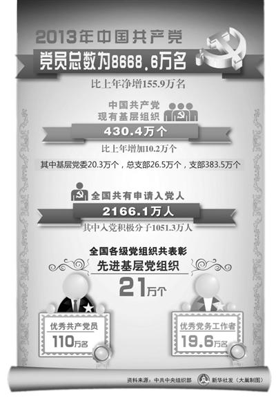 中央組織部最新黨內(nèi)統(tǒng)計數(shù)據(jù)顯示,截至2013年底,中國共產(chǎn)黨黨員總數(shù)為8668.6萬名,比上年凈增155.9萬名,增幅為1.8%;黨的基層組織總數(shù)達430.4萬個,比上年增加10.2萬個,增幅為2.4%。數(shù)據(jù)表明,中央關(guān)于黨員隊伍建設(shè)和基層黨組織建設(shè)的新部署新要求得到了較好落實。