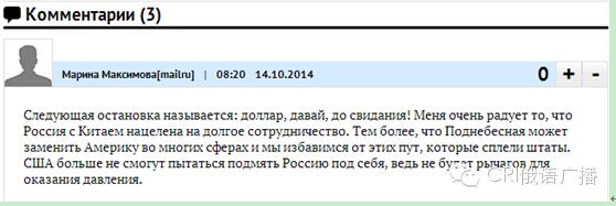 網(wǎng)友馬克西莫娃評(píng)論說:“下一步就該和美元說再見了!我非常高興地看到,俄羅斯與中國致力于長期合作。中國將在眾多領(lǐng)域取代美國,我們將擺脫美國的羈絆。美利堅(jiān)再也不可能把我們踩在腳下了,因?yàn)橄蛭覀兪〾旱墓ぞ咭呀?jīng)失效。”