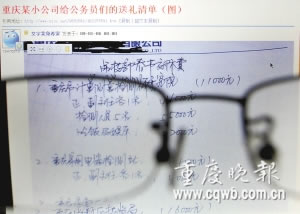 “過(guò)年了,企業(yè)開(kāi)始送錢(qián)了!”6日,天涯論壇重慶社區(qū)、重慶記者之家等網(wǎng)站驚現(xiàn)一份給公務(wù)員、檢驗(yàn)站的“送禮清單”。這份清單共涉及20個(gè)紅包,個(gè)個(gè)上千元,最高2000元。
