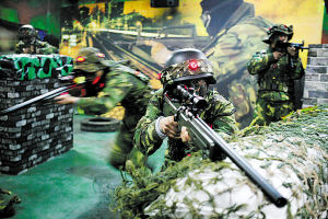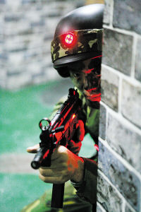 頭頂上機(jī)群盤(pán)旋俯沖,身邊槍聲、爆炸聲此起彼伏,一場(chǎng)激烈的對(duì)抗正在一個(gè)特殊的“戰(zhàn)場(chǎng)”進(jìn)行。1月8日上午,記者在濟(jì)南軍區(qū)某團(tuán)真人CS對(duì)抗陣地看到:“戰(zhàn)場(chǎng)”上矮墻林立、沙包堆積、枯樹(shù)橫亙……戰(zhàn)士們身著作訓(xùn)服,手持仿真槍?zhuān)^戴裝有感應(yīng)器的頭盔,在時(shí)明時(shí)暗的“夜空”下穿梭,尋找目標(biāo),激烈對(duì)抗。據(jù)有關(guān)負(fù)責(zé)人介紹,實(shí)施真人CS對(duì)抗練兵在我軍部隊(duì)還是首家。(CS是Counter-strike的縮寫(xiě),中文意為反恐精英。)