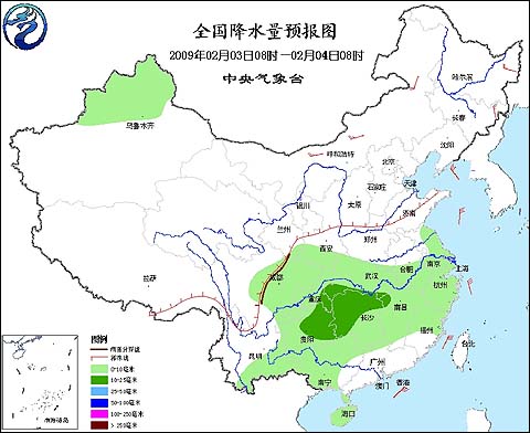 中央氣象臺(tái)2009年2月3日06時(shí)發(fā)布未來(lái)三天天氣預(yù)報(bào):