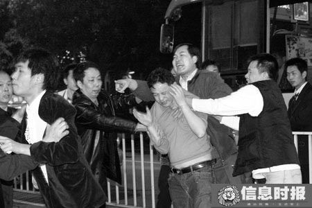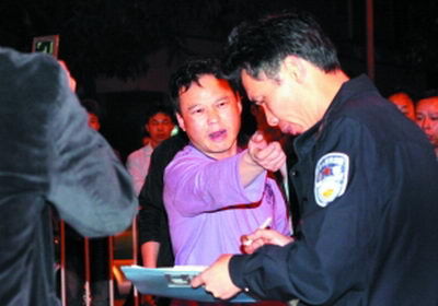 在現(xiàn)場,記者看到該名穿淺紅色衣服的男子在不停打電話,該名男子身高大概1米65左右,情緒暴躁,揮舞手臂。在接受警方調(diào)查時,該名男子忽然一拳將旁邊面包車司機的兒子陳家文打倒在地。隨后還推開前來執(zhí)勤的交警!澳銈?nèi)枂枺恢牢沂钦l?”該名男子向人群叫囂,現(xiàn)場一片混亂。 (信息時報)