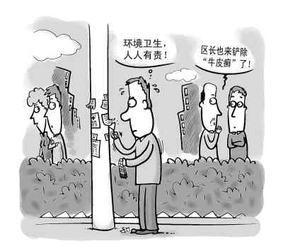 當(dāng)日上午,濟(jì)南經(jīng)十路槐蔭段,一支特殊的勞動隊(duì)伍吸引了眾多行人的目光。從擔(dān)山立交橋到槐蔭區(qū)政務(wù)中心,近4公里路段,沿路看去,都是忙碌的工作人員。他們有的擦護(hù)欄,有的鏟除非法小廣告,有的掃綠化帶里的污物,有的蹲下身擦路面上的痰漬。旁邊幾位健身的老人見狀,主動加入到了清理垃圾的行列。在兒童醫(yī)院東側(cè),槐蔭區(qū)區(qū)長楊峰手拿一個噴壺和一把小鏟子,用心清理非法小廣告?吹揭患译娦艩I業(yè)廳前的電線桿上貼滿小廣告,他先是用噴壺噴水,把紙弄濕,然后用小鏟子快速鏟凈。不多會兒,桿子上的非法小廣告消失殆盡。接下來,他又用抹布把桿子擦得干干凈凈。