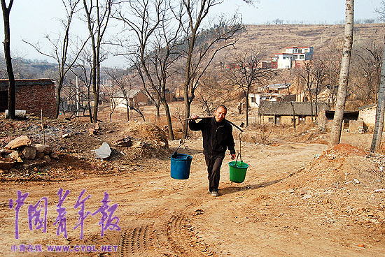 “面對這種情況,鄉(xiāng)里采取兩個步驟來解決張溝村人畜吃水難問題!本皶悦鲗χ袊嗄陥笥浾哒f,“首先是解燃眉之急。春節(jié)后,鄉(xiāng)里組織了4臺抗旱送水車,和武警部隊鄭州支隊的2臺送水車一起,開始為張溝免費送水。爭取把每家每戶的水窖都裝滿。我們還準備再打兩眼深井,把提灌和自來水的管網(wǎng)配套設施都弄好,把自來水送到每個村民家里!