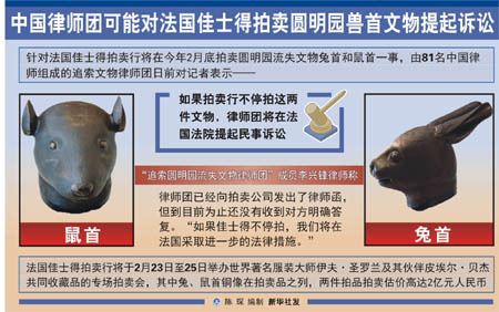 針對法國佳士得拍賣行將在今年2月底拍賣圓明園流失文物兔首和鼠首一事,由81名中國律師組成的追索文物律師團日前對記者表示,如果拍賣行不停拍這兩件文物,律師團將在法國法院提起民事訴訟。