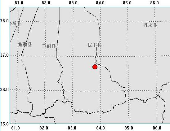 據(jù)測定,地震發(fā)生于當天夜間21時52分(北京時間),震中位于北緯36.7°,東經(jīng) 83.8°。目前尚未接到有關(guān)人員及財產(chǎn)損失的報告。