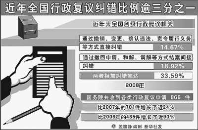 “行政復(fù)議化解行政爭(zhēng)議的作用日益明顯。”2月19日,國(guó)務(wù)院法制辦主任曹康泰在全國(guó)行政復(fù)議工作經(jīng)驗(yàn)交流暨“雙先”、“雙優(yōu)”表彰大會(huì)上介紹,2008年,國(guó)務(wù)院共收到行政復(fù)議申請(qǐng)866件,比2006年增長(zhǎng)近90%,全國(guó)每年通過(guò)行政復(fù)議化解的行政爭(zhēng)議約8萬(wàn)件左右。