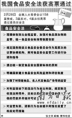 昨日,十一屆全國(guó)人大常委會(huì)經(jīng)表決,以158票贊成、3票反對(duì)、4票棄權(quán)高票通過(guò)了食品安全法。