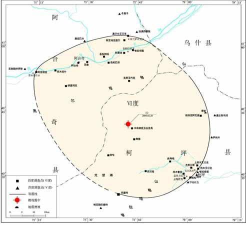 2009年2月20日新疆柯坪縣5.2級地震等震線圖