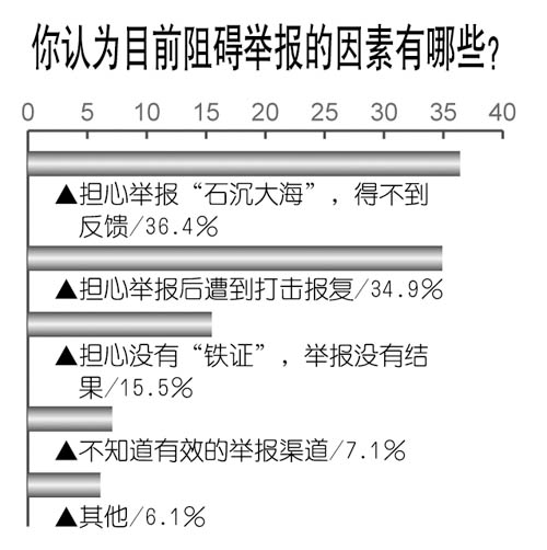 調(diào)查中,公眾給出的阻礙舉報(bào)的因素排序依次為:擔(dān)心舉報(bào)“石沉大!,得不到反饋(36.4%);擔(dān)心舉報(bào)后遭到打擊報(bào)復(fù)(34.9%);擔(dān)心沒有“鐵證”,舉報(bào)沒有結(jié)果(15.5%);不知道有效的舉報(bào)渠道(7.1%)。
