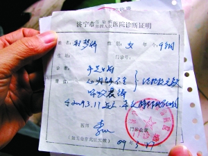 程傳勝,28歲,巨野縣章縫鎮(zhèn)程莊村人,他出具的女兒“診斷證明”上記載,程夢(mèng)嬌被診斷為“手足口病、心力不全、呼吸衰竭”,于2009年3月17日死亡,“特作此證明!边@份證明上,蓋有濟(jì)寧市傳染病醫(yī)院門(mén)診部的紅色印章。
