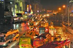 在天河立交,水深沒過車輪,約5輛機動車死火。大雨傾盆,公交車難進站,乘客大排長龍。在天河五山茶山小區(qū)翠華苑門口,十幾輛機動車泡在水里。記者觀察發(fā)現,塞車問題一直延續(xù)到晚上約10時。