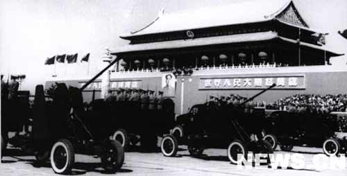 中國人民解放軍代理總參謀長聶榮臻乘車率領(lǐng)武裝部隊進入廣場,通過檢閱臺前,向西行進。全場熱烈鼓掌,向他們表示歡迎。