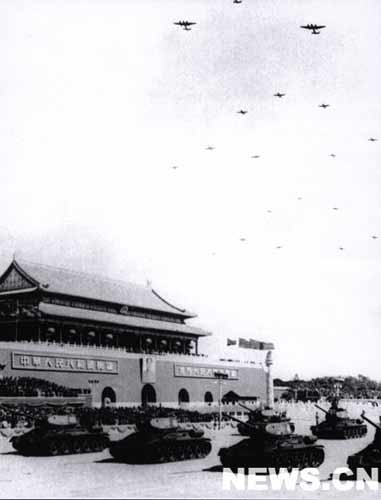 閱兵式開始。中國人民解放軍朱德總司令乘車閱兵。閱兵后,朱德總司令登臨檢閱臺宣讀《中國人民解放軍總部給全國武裝部隊的命令》,接著進行武裝部隊的分列式。