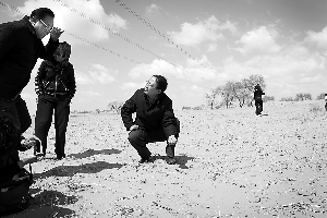 郭虎帶著氣象臺的年輕預(yù)報(bào)員,進(jìn)入一處沙地。當(dāng)時(shí)風(fēng)很大,吹得大家睜不開眼睛,“瞬間風(fēng)力能達(dá)到五六級!辈贿^,沒有沙塵。郭虎蹲下去,用手抓起一把沙子,一松手,沙子被吹出不遠(yuǎn)就飄落了。“這說明沙子里的水分很多!惫⒂檬峙倨鹕匙觼,深不到1厘米的表層下,沙子都是濕的。