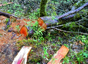 據(jù)曾到過現(xiàn)場的環(huán)保人士許靖(音)稱,4月5日,她和同伴去玉獅場原始森林中了解古樹認養(yǎng)情況時,發(fā)現(xiàn)有兩棵紅豆杉被砍,另有一棵接近根部處已被砍了個大口子。“當?shù)卮迕裾f,被砍的紅豆杉至少有三四百年樹齡!币幻o林員對記者稱,當?shù)厝酥兰t豆杉是保護樹種,從不砍伐。