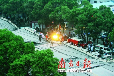 當(dāng)時,數(shù)聲巨響鉆進株洲市民李先生的耳朵。辦公室的同事隨即放下手中的工作,擠在窗口急切地想看下面發(fā)生了什么。一位女同事指向紅旗廣場的方向,用驚恐的聲音告訴他們“垮橋了”。李先生放眼望去,垮橋的地點,距離他辦公室不過數(shù)百米的紅旗廣場附近。