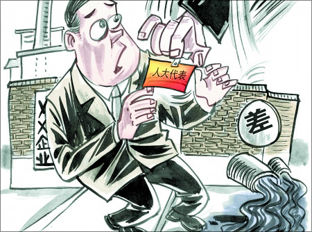 輝縣市有一家造紙廠的負責人是新鄉(xiāng)市人大代表,該造紙廠治污設備長期閑置,經常偷排污水,環(huán)保部門去檢查時,負責人總是敷衍,由于其特殊的身份,在當?shù)卦斐闪瞬涣嫉挠绊。這次對人大代表調研評價時,環(huán)保部門給其一個“差”的評語,這位人大代表再次提名時沒能通過。