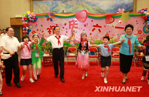 “五十六個(gè)民族,五十六朵花……”伴隨著《愛我中華》的樂曲聲,溫總理和孩子們手拉手歡快地跳起舞蹈。