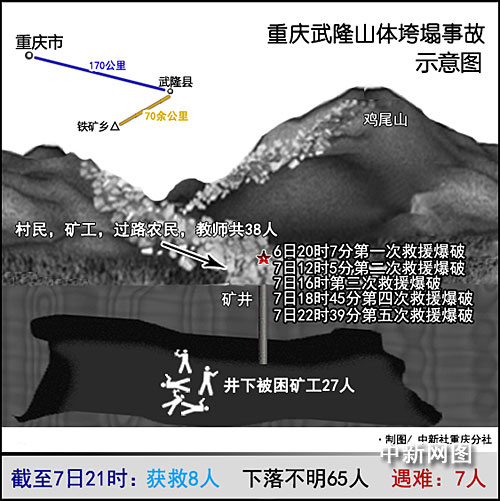 5日下午3時發(fā)生的重慶市武隆縣鐵礦鄉(xiāng)雞尾山山體垮塌災(zāi)害,直接導(dǎo)致山對面的三聯(lián)采礦場和幾所民居及一些路人被埋。經(jīng)過兩天兩夜的搜救工作,截至7日23時,救援人員已發(fā)現(xiàn)7位遇難者遺體。包括此前救出的8名傷者和證實2名失蹤者當(dāng)時不在事故現(xiàn)場外,尚有65人下落不明,其中,被埋井下有礦工27人。