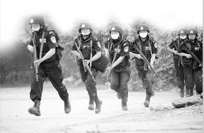 經(jīng)過1小時(shí)的現(xiàn)場處置,當(dāng)?shù)鼐綄ⅰ翱植婪肿印眹?yán)密封控在工廠一區(qū)域內(nèi)。但“恐怖分子”沒有絲毫棄械投降的意思,仍舊挾持人質(zhì)與警方對(duì)峙,并威脅炸毀化工設(shè)施。此時(shí),接到報(bào)警的河北省反恐指揮中心迅速啟動(dòng)省級(jí)反恐預(yù)案,成立省級(jí)反恐指揮部,并派省級(jí)公安特警、武警、消防、衛(wèi)生、氣象和環(huán)保力量,迅速趕往涿州現(xiàn)場增援處置。與此同時(shí),國家也緊急調(diào)派國家反恐應(yīng)急處置力量——— 武警“雪豹突擊隊(duì)”和解放軍“三防醫(yī)學(xué)救援隊(duì)”前往現(xiàn)場增援。