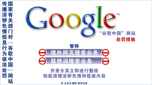 全國整治互聯(lián)網(wǎng)低俗之風(fēng)辦公室19日向媒體透露,國家有關(guān)部門已經(jīng)召見“谷歌中國”網(wǎng)站負責(zé)人,對該網(wǎng)站大量傳播淫穢色情內(nèi)容進行執(zhí)法談話,宣布暫停該網(wǎng)站境外網(wǎng)頁搜索業(yè)務(wù)和聯(lián)想詞搜索業(yè)務(wù),并責(zé)令其立即進行整改,徹底清理淫穢色情和低俗內(nèi)容。