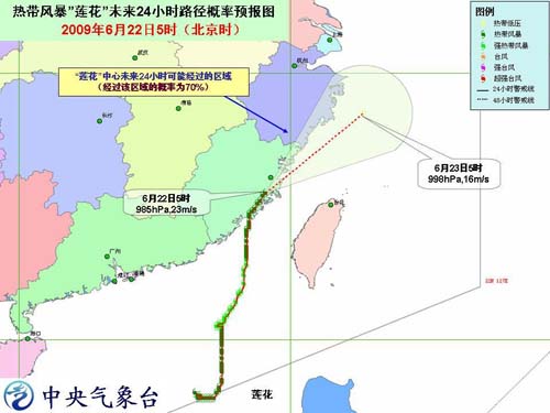 中新網(wǎng)6月22日電 中央氣象臺(tái)今天早晨六時(shí)發(fā)布臺(tái)風(fēng)消息:今年第3號(hào)熱帶風(fēng)暴“蓮花”(LINFA)已于昨天晚上8時(shí)30分前后在福建晉江東石鎮(zhèn)登陸,登陸時(shí)中心附近最大風(fēng)力有9級(jí)(23米/秒)!吧徎ā钡顷懞笙虮逼珫|方向移動(dòng)。今天早上5時(shí)風(fēng)暴中心位于福建省莆田市境內(nèi),就是北緯25.5度,東經(jīng)119.1度,中心附近最大風(fēng)力有9級(jí)(23米/秒)。