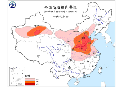 中新網(wǎng)6月25日電 據(jù)中國氣象局網(wǎng)站消息,中央氣象臺今天早晨六點(diǎn)鐘繼續(xù)發(fā)布高溫橙色警報(bào):預(yù)計(jì),今天白天,華北大部、黃淮、江淮、江漢、江南北部及陜西大部、寧夏中北部、甘肅北部、內(nèi)蒙古中西部和新疆南疆盆地有35℃以上的高溫,其中,河北大部、京津、山西大部、山東大部、陜西東部、河南、安徽中北部、江蘇西北部及南疆盆地東部等地最高氣溫可達(dá)37~39℃,河北中南部、京津南部、河南中北部、山西南部、山東西部及南疆盆地東部等地局部氣溫可達(dá)40℃。