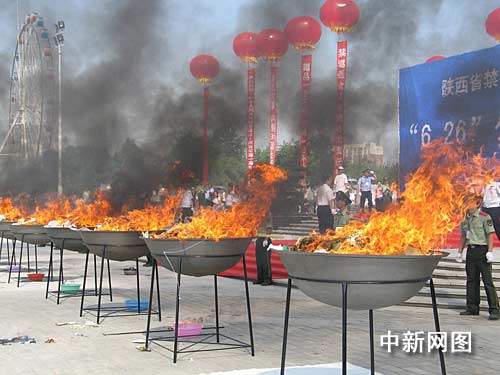 中新網(wǎng)西安6月26日電(記者 冽瑋)6月26日是第22個(gè)國(guó)際禁毒日,今年的主題是“依法禁毒 構(gòu)建和諧”。今天上午,陜西省禁毒委在咸陽(yáng)市統(tǒng)一廣場(chǎng)公開(kāi)集中銷毀繳獲的313公斤毒品。