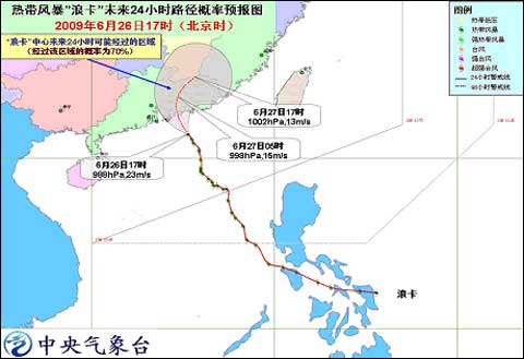 今年第4號熱帶風(fēng)暴“浪卡”(NANGKA)的中心今天下午5時位于廣東省惠東縣南偏東大約140 公里的南海北部海面上,就是北緯21.4度、東經(jīng)115.3 度,中心附近最大風(fēng)力有9級(23米/秒)。