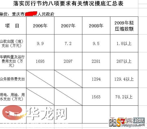 網(wǎng)友曝出的這份某區(qū)“落實厲行節(jié)約八項要求有關(guān)情況摸底匯總表”顯示,2006年,重慶某區(qū)政府在公車購置及運行費用一項上花掉了1693萬元,此后兩年開銷不見回落,至2008年已高達2281萬元。今年,政府厲行節(jié)約八項要求,“勒緊公款腰包”,公車一項亦擬花2000萬左右。除此之外,該區(qū)政府去年于公款出國(境)支出9.5萬元,公務(wù)接待用了1294萬元,用電、用水、用油花了1563萬。如此巨額公費開支,令人震驚。