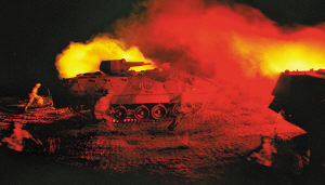 “新大綱規(guī)定,夜訓(xùn)按照年度訓(xùn)練總時間20%的比例安排。今年,我們著力提高夜間單兵專業(yè)技能的生成和轉(zhuǎn)化。”盛團長話音剛落,伴著隆隆的炮擊聲,夜暗深處火光頻閃。原來,該師新型教練員、二營教導(dǎo)員杜文斌正在組織官兵進行坦克夜間教練射擊課目訓(xùn)練。眼前景象大出記者意料:目標(biāo)顯示不再是一盞孤燈,而是以打信號彈、模擬射擊火光和車輛閃爍明滅的燈光等多種方式,大大增加了射擊難度!皵橙松鋼襞诳谝婚W,你能不能馬上回敬一炮?我們練的就是這個!”杜文斌自豪地說。