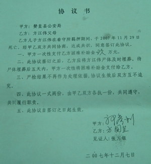 7月1日本報(燕趙都市報)刊發(fā)的《疑犯被逼喝涼水致終身殘疾》如一石擊水,讓"牢頭獄霸"、"躲貓貓"、"喝涼水"再次成為社會關(guān)注的焦點。而令人震驚的是,在調(diào)查秦英偉"喝涼水"致殘案過程中,本報記者又有驚人發(fā)現(xiàn):同是贊皇縣看守所,2007年4月至11月半年多時間內(nèi),兩個在押疑犯暴斃,最后都由當(dāng)?shù)毓膊块T出錢"協(xié)商解決",一位死者家屬給了"困難補助金"9萬元,另一位死者的家屬給了1.5萬元。