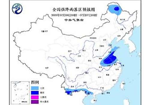 中新網7月6日電 中央氣象臺6日06時發(fā)布暴雨預報:預計今天白天到夜間,內蒙古東北部、黑龍江西北部、山東南部和東部、河南南部、蘇皖中北部、云南南部、廣西南部等地的部分地區(qū)有大雨。