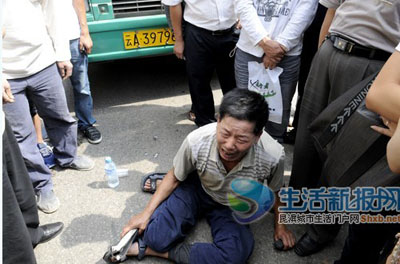 一名50多歲的男子擋在一輛77路公交車前,坐在地上痛哭,民警怎么勸說他也不愿意離開。男子稱:“這些城管太不講道理了,他們快把我的兒子打死了!睋(jù)該男子介紹,20多名城管人員昨日早上將其兒子打傷,兒子被送進醫(yī)院搶救,而打人的城管全部跑了,“實在是沒有辦法,我兒子不能白白受罪,無奈之下,我只能通過這種方法引起相關部門的重視!
