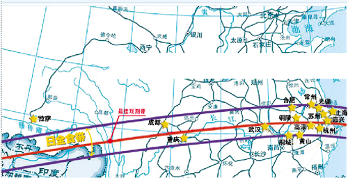 同時(shí),這也是世界歷史上覆蓋人口最多的一次日全食。據(jù)中國(guó)國(guó)家天文臺(tái)預(yù)報(bào)稱,中國(guó)可觀測(cè)到這次日全食的地區(qū)包括西藏東南部、云南西北部、四川、重慶、湖北、湖南北部、安徽、江西北部、江蘇南部、浙江北部和上海。其中,武漢、銅陵、桐城、湖州、常州、無(wú)錫、蘇州、杭州、嘉興、紹興、上海、寧波、舟山13個(gè)城市位于日食帶內(nèi),適宜進(jìn)行日全食觀測(cè)。全國(guó)其他區(qū)域也均能看到日偏食。據(jù)太陽(yáng)移動(dòng)軌跡,長(zhǎng)江沿線一帶的居民都能大飽眼福。所以,世界天文學(xué)界甚至稱此次日食為“中國(guó)日全食”。