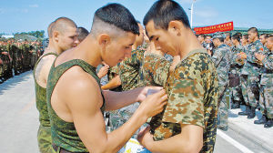 這時,一名俄方隊員從褲兜里掏出一枚徽章,遞到對面的中方隊員手中。由于比賽在即,中方隊員接過徽章后就往褲兜里放。哪知,俄方隊員迅速從他手中拿過徽章,親手給中方隊員佩戴在了迷彩短袖衫上。這名中方隊員會心一笑,與其再次擊掌,然后共同抓起拔河的大繩。觀戰(zhàn)的中俄官兵看到這一情景,立即報以熱烈的掌聲。