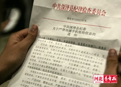 記者了解到,深澤縣委常委、紀(jì)委書記張慶民是此事的主要推動者之一。在他們的推動下,經(jīng)多次討論,并向深澤縣委多次匯報后,才出臺了“嚴(yán)禁傳播手機低俗信息的通知”。