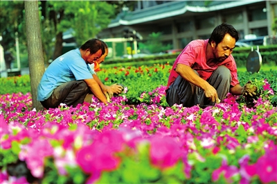 昨天,在交通部對面的綠化帶里,20多位園林綠化工人正在修剪枝椏,空地上擺滿了小花盤,紅黃綠紫,顏色多樣,引來眾多市民觀看。市園林綠化局透露,根據(jù)國慶60周年北京花卉景觀布置規(guī)劃,全市將布置各類花卉共達(dá)4000萬盆。其中,天安門廣場將在十一期間設(shè)置一組中心花壇,長安街沿線步道將布置22處立體花壇,面積達(dá)十萬余平米。其中,天安門廣場中心花壇作為主花壇,現(xiàn)暫定將安排在天安門中心廣場偏南10米的位置,呈圓形,突出“普天同慶”的主題;▔睆綄⑦_(dá)40米,中心主花籃高達(dá)13米,將選用真假花卉結(jié)合的方式,主選花種有粉矮牽;、小黃菊等。市園林綠化局負(fù)責(zé)人表示,主花壇的設(shè)計(jì)和布置還未最終確定,將在國慶游行排練之后,按實(shí)際需要做相應(yīng)的修改和調(diào)整。