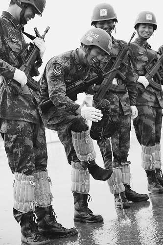 由戴著白口罩的守衛(wèi)士兵測量體溫后,9月3日下午,記者進入空軍某機場——國慶60周年閱兵方隊訓(xùn)練場,從衣食住行各方面親身感受受閱將士的訓(xùn)練生活。