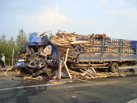 記者趕到現(xiàn)場時(shí)看到,現(xiàn)場已經(jīng)設(shè)立了警戒線,一輛白色大客車頭部扎進(jìn)路邊溝內(nèi)樹林,頂著兩棵小樹,只有后輪還搭在柏油路上?蛙嚽安颗で図斏w被掀起,風(fēng)擋玻璃破碎,車前部、地上、車內(nèi)到處可以看到斑斑血跡,還有一些零碎物品。在距離客車車尾4米左右,一輛拉著木板的藍(lán)色貨車車頭朝向松原方向停放在路上,車前部全部凹陷進(jìn)去,里面有大量血跡,車上木頭散落一地。