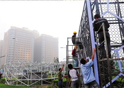昨天凌晨1點,國慶花壇“鳥巢”、“水立方”等景觀骨架基本成型,“降落”在長安街東單路口。這意味著國慶花壇的布置大幕正式拉開,長安街花壇將陸續(xù)上崗。此外,從即日起,朝陽公園橋東等環(huán)線花壇景觀也將相繼搭建完成。