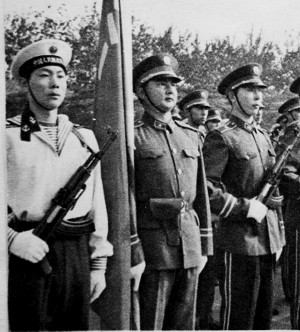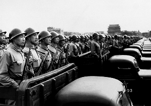 1949年10月1日開國大典,因為全軍沒有統(tǒng)一的服裝,按照閱兵指揮部的要求,受閱的陸軍部隊全部著黃綠色軍裝,頭戴鋼盔,帽徽為“八一”紅五星,左胸前佩戴印有“中國人民解放軍”字樣的長方形胸章。受閱的海軍方隊,干部戴白色大檐帽,扎白色腰帶;戰(zhàn)士戴白色水兵帽,腦后飄動著兩條黑色緞帶,身著藍白相間的;攴。空軍飛行員身著飛行服駕機受閱。受閱的女兵則穿著黃色的連衣裙。