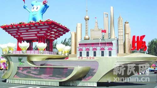 這輛名為“騰飛上!钡牟受囬L(zhǎng)15米、寬6米,猶如一艘破浪前行的金色航船,船首是中共一大會(huì)址的建筑造型,背后是浦江兩岸的高樓大廈,后方為上海世博會(huì)中國(guó)館,上面有海寶揮舞國(guó)旗和鮮花,整個(gè)造型突出“上海背景,世博主題”,象征著上海乘風(fēng)破浪,朝著建設(shè)國(guó)際金融中心和國(guó)際航運(yùn)中心的目標(biāo)快速前進(jìn)。