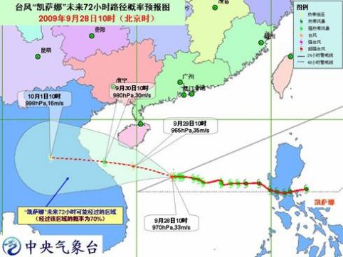 預(yù)計(jì),“凱薩娜”將以每小時(shí)15公里左右的速度向西偏北方向移動(dòng),強(qiáng)度還將有所加強(qiáng),并逐漸向海南南部沿海靠近,將于29日經(jīng)過(guò)海南南部近海后,向越南中北部沿?拷。